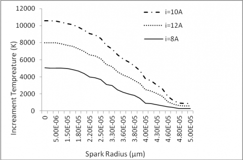 In Figure 5 the highest temperature recorded for 12A current is 4500K and in Figures 6 & 7 it is 8000k & 10000K at 12A current. From the above three figure it can be concluded that at high current the discharge gets in- creased due to which the surface temperature of the work piece gets increased. It can be shown from Figure 7 that at 8A the increment of temperature is around 5000K (Ton=200µS) which is similar to the trend line of Figure 6 at current 12A, which means the heat flux is directly proportional to the erosion rate process. All the curve shows a decrease rate towards the center of the radius and at 5E-5µ m the temperature gets lowered up to 273K. But at center of the work piece highest temperature recorded.