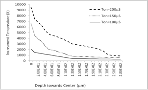 In Figure 5 the variation of the temperature along the spark radius at different Pulse On time has been plotted. The effect of different amount of current on temperature at Voltage-50V on work piece has been shown by the Figures 5, 6 & 7. In Figures 5, 6 & 7 all the increment of temperature line shows a bell shaped curve.