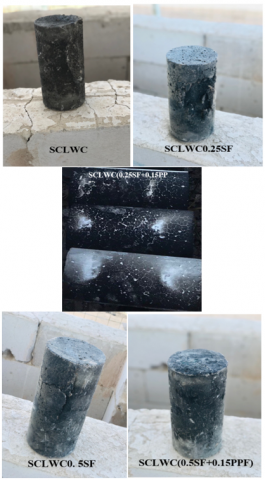 While the polypropylene and micro steel fibers in hybrid mixes resisted the risk of spalling of SCLWC sample after exposure to fire flame, as shown in Figure 10. The particular characteristics of PPF help to enhance the durability of concrete and make it more resistant to fire damage. When exposed to high temperatures, these fibers create empty spaces within the concrete, allowing moisture in both liquid and vapor forms to escape more easily. This lowers internal pressure and prevents the surface of the concrete from cracking or flaking due to the build-up of moisture [11].