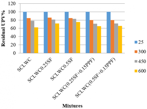 Also, Figure 13 reveals that the residual UPV of hybrid mixes were lower than that the residual UPV of reference mix at 300℃ and 450℃. In fact, at a temperature of 160℃, the volume of polypropylene fibers commences diminishing due to the onset of melting. As the temperature further rises, the fibers undergo degradation, initiating the ignition process at temperatures nearing 360℃. This is leading to increased porosity and microcracking [27].