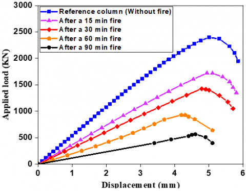 (4) Similarly, when the fire duration was increased, i.e., 15, 30, 60 and 90 minutes, the load-bearing capacity of the column decreased significantly until failure.