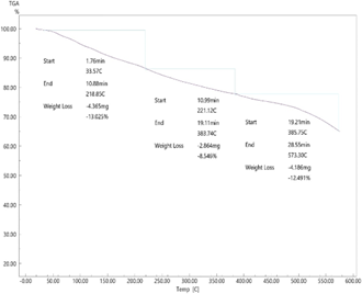 Figure 11 shows the TGA weight loss comparison among ZA1, ZP3, and ZP4. The bar graph shows that ZA1 lost the least (16.72%), followed by ZP4 (31.60%) and ZP3 (34.06%). Polymerization may have introduced more flexible moieties that diminish thermal stability, as ZP3 and ZP4 degrade more. Figures 12-14 show ZA1, ZP3, and ZP4 thermal degradation patterns from TGA.