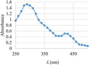 The UV–visible spectrum of the A2 was recorded in ethanol, revealing distinct absorption features within the wavelength range of 250 to 500 nm, as illustrated in Figure 3.