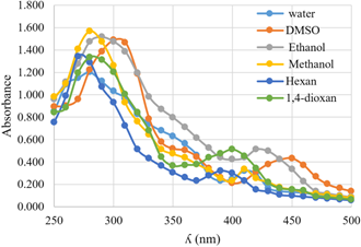 A standard solution of ligand 2A1 (1 × 10⁻³ M) was prepared in ethanol. Subsequently, a series of diluted solutions (1 × 10⁻⁴ M) were prepared using various solvents with different dielectric constants, including water, ethanol, methanol, hexane, 1,4-dioxane, and DMSO.