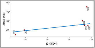 An absorption spectrum of A1 was showed a band at 290 nm and 420 nm corresponding to a π→π* and n → π* electronic transitions respectively. These finding were matching the structure of A1, which is contain a long π-conjugated system across multiple aromatic rings and imine (–CH=N–) groups. Also, it has azo (-N=N-) groups and electron-withdrawing groups (EWGs) groups beside the phenyl rings and this conjugated system allows π → π* and n → π* transitions. Therefore, the effects of different solvents in the structure of A2 were studied through the variation in their dielectric constant (D), see Figure 4.