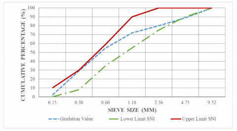 Figure 1 shows the results of the fine aggregate gradation analysis, indicating the percentage of aggregate particles and the defined gradation limits. Based on the gradation test, the fine aggregate meets the criteria with a fineness modulus (FM) value of 2.73, which complies with the SNI 7656:2012 standard range of 2.4 to 3.