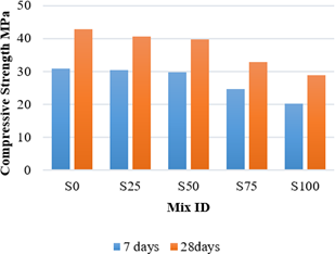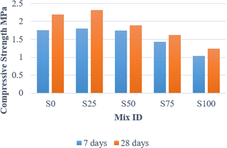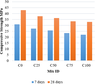 Compressive strength findings are listed in Figures 4 and 5. Results show that the compressive strength decreases with the presence of RCA content in the mix. However, the different RCA content showed an unpredictable trend. The C25 and S25 mix exhibited the highest strength value compared to those shown by C25 and C100. Additionally, the S25 mix exhibited the highest strength value compared to the C25 mix.