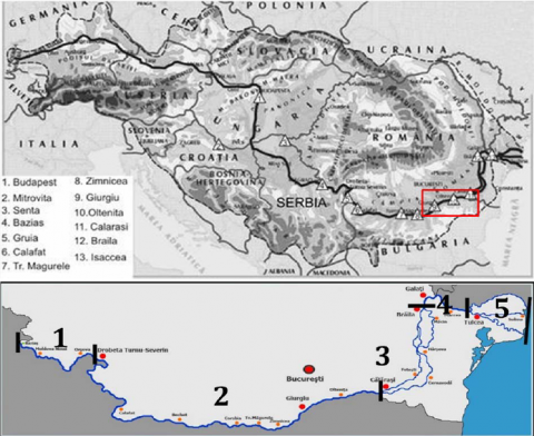 The Danube is considered the second longest river in Europe with a length of 2850 km after Volga (3690 km). The surface of its catchment area is of 805300 km2 and it crosses the centre of Europe from West to East, passing through 10 countries, from its source localized in the Black-Forest Mountains, in Germany (Figure 1). In Romania (the lower sector), the Danube has a length of 1075 km between Baziaș and Sulina localities, of which 800 km forms the border with Serbia, Bulgaria, Moldavia and Ukraine. The remaining 275 km situated in Romania, include the largest islands, cultivated with heterogeneous crops. The river drains 93% of the Romanian territory and flows into the Black Sea through a delta well-known as a reservation of the biosphere. The lower Danube has important local particularities for the economy: the Carpathian defile; the fluvial sector; the fluvio-maritime and maritime sectors. The width of its major channel is variable, from less than 1 km to more than 10 km, and its maximum value is more than 30 km on the ramification sector between Călărași and Brăila. The altitude diminishes along the Danube River. Upstream of Oltenița it surpasses by 3 m the average level of the Danube. It is delimited by the terraces, the number of which decreases from West to East. The lowest terrace develops along the river from Baziaș to Brăila; its altitude varies from 5-6 m to 12-13 m, being occupied by towns and villages, which have also extended in the major channel and are exposed to flood risk [4].