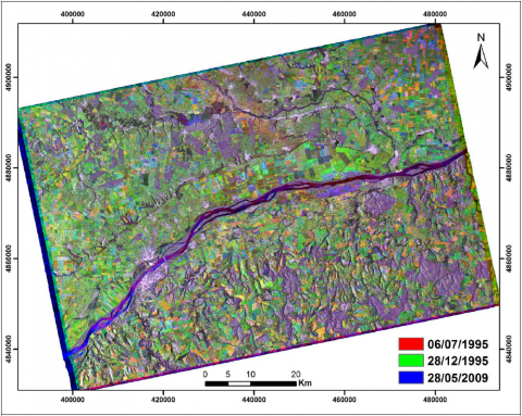 A radar amplitude image allows having instant information from the region in the image and, as the radar is a tool available all the time and in any meteorological conditions, the colour composition enables the detection of changes occurred between two dates. We have made several couples of colour composition at different intervals. With the purpose of monitoring the changes of the study sector between 1995 and 2009, we here show the making of two colour compositions starting from three images from the same date, one of amplitude (Figure 5, (a)) and the other of intensity (Figure 5, (b)). We have attributed the (Blue) to the date of July 6, 1995, the (Green) to December 12, 1995 and the (Red) colour to the date of May 28, 2009.