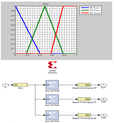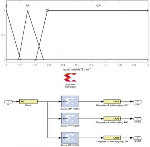 Figure 2 shows an example of implementation on "Xilinx System Generator" of a linguistic variable called "Error" that takes 3 linguistic values "GP" (Grand Positive), "PP" (Small Positive) and "ZE" (Zero), discretized on a universe of standardized speech [0, 1]: