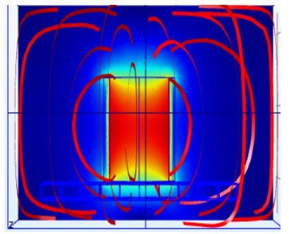 where, ω is the circular angular frequency of excitation, σ is the material conductance, A is the magnetic potential vector, Je is the current density in a medium and B is the magnetic flux density, Figures 3 shows the magnetic flux density of the system coil-particles sample.