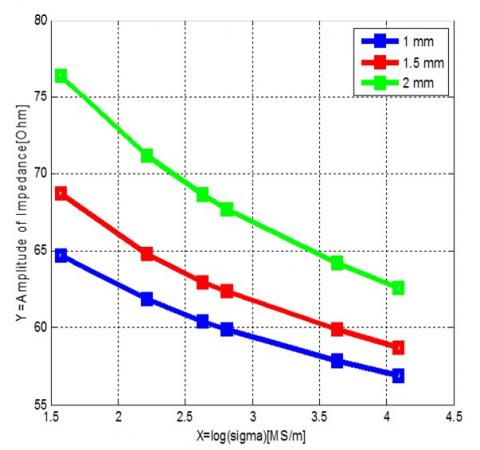 We present on the Figure 7 the response of the sensor (Impedance module) for the three values of the thickness depending on the thickness of the particles, for three values of the thickness and depending on the electrical conductivity of the materials.