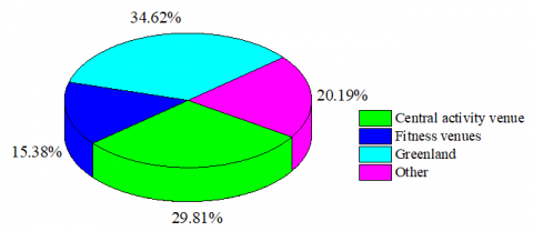 The application of landscape resources and the utilization of landscape elements directly affect the functions of the landscape areas in the residential neighborhood and their practicality [12]. To figure out the spatial differences in the public landscape of residential neighborhood in Hangzhou, this study chose 26 typical residential neighborhood or communities from 4 districts in Hangzhou (Xihu district, Binjiang, district, Xiaoshan district, and Yuhang district) as the research objects, and nearly a thousand questionnaires were distributed. Figure 2 shows the statistics of land occupation rates of public landscape in residential neighborhood of Hangzhou, the average land occupation of central activity venue, fitness venue, and green space is 29.81%, 15.38% and 34.62%, respectively. Scholars found that, with the continuous development of urban areas in Hangzhou, there are many problems with the public landscape in the residential neighborhood, such as too-large or too-small outdoor activity venues, too few plant species and quantities, water pollution problem with the greening in the area, etc. [13]. Most of the existing buildings are high-rise architectures which lack the connection with surrounding environment, many residents do not have good landscape environment, and their living environment lacks the connection with natural environment [14]. The design of public landscape in residential neighborhood includes activity landscape, exercise landscape, and green landscape, etc. [15].