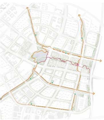 From a global view, the landscape design scheme of Qiaosi-II River is an integrated design scheme of various venues, buildings and landscape in the region, it has carefully designed the roads and paths in the area and fully respected the original ecology of the site. The overall design takes the landscape of Fengshou Lake as the center, the Wisdom Valley Innovation Park as the green axis; it designs two waterfront industrial corridors, two image display corridors, and four waterside life corridors; and it also includes the planning of multiple communities. The landform of the site is mostly farmland, and the terrain is flat; based on a general idea of “expanding the storage area of the lake and dredging the main riverways”, a storage lake of the Fengshou Lake is planned and the central lake area is designed to cover an area of 0.06km2, the lake can reduce the drainage pressure of the planned commercial area in case of heavy rains. Then, through the riverway reinforcement construction project, the design scheme plans a new port, the Triangle Port, and two new rivers, the Jiubao #1 River and #2 River, to break the water blocks, and unclog the water system, thereby forming a main drainage river network system of the commercial area and ensure the smooth drainage of the site.