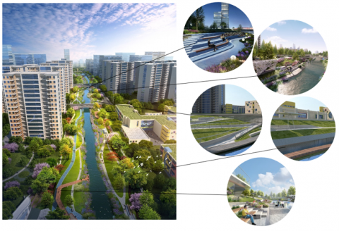 (3) The overall planning of Qiaosi-II River forms a spatial structure of “one center, one axis, three rings, eight lines and multiple nodes”, from a global view, it gives an integrated design of buildings and landscapes in various regions such as commercial area, health care area, fitness area, green area, and play area for kids.