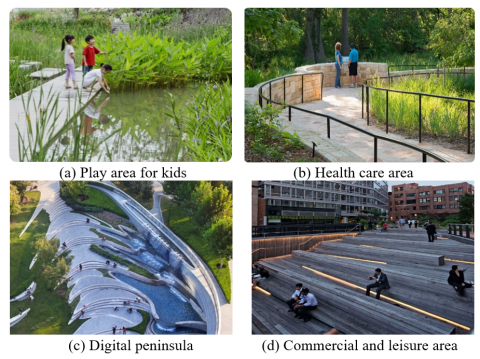 Figure 7 shows a few sketches of the landscape design scheme of Qiaosi-II River, it includes commercial area, health care area, fitness area, green area, and play area for kids, etc. Based on the overall layout of the greenbelt system, the designed greenbelt in this scheme is located on the east side of the site, it runs through the area and leads visitors from the Ciyuan Road to the site. Figure 8 gives a few photos of public landscape in some other residential areas. Figure 8(a) is a play area for kids, a mirror gallery introduces visitors into the area, and an iris-themed waterfront plant science garden built based on the original water environment provides residents and kindergarten children with more opportunities to get close to and learn about nature [20]. Figure 8(b) is a health care area for residents, it makes use of the high density of negative oxygen ions in the waterfront tree-shaded environment in the afternoon and provides a green and health-keeping venue for residents. Figure 8(c) is a digital peninsula, it is a leisure space surrounded by technological landscapes, and it can inspire the residents to think about the connection between technological development, city, and life. Figure 8 (d) is a commercial and leisure area, it provides a comfortable outdoor dating space for surrounding staff and residents; based on the characteristics of the site, the design makes use of the vertical space and turns it into a place where residents can stay and take rests, the design combines the site functions with its characteristics [22-24].