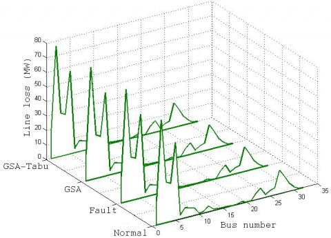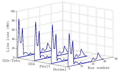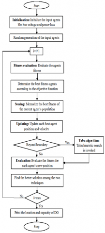 One of the main metaheuristic optimization algorithms that seek better solution based on balance of two correlated idea, like exploration and exploitation [35]. The exploration seeks to understand the connectivity relationship of search space that useful to optimal global solution; the scan looks to best optimal solutions at adjacent area of visited domain that may strengthen the convergence capacitance of local search. Therefore, an excellent algorithm could perform the scanning capacity at initial stage and improve the exploiting capacity at second stage to maximize repetitions. At standard GSA, direction of movement of every agent is demonstrated to total force that another best agent’s act on him and lack of communication among agents. Hence, the GSA algorithm is hybridized with the Tabu search algorithm. The Tabu heuristic search algorithm contains major merits like restriction of some search of neighboring solutions, aspiration allowing exception and accessible solutions. Here, the GSA updated agents positions were checked out beyond the boundary or not, which is beyond the boundary means Tabu heuristic process is invoked or else the normal process is performed. Finally the best solution is judged through the methods’ results. The process of established hybrid method is in brief explained at below. Hybrid method input parameters are IEEE distribution system bus voltage as well as power loss that explained at next Eq. (12).