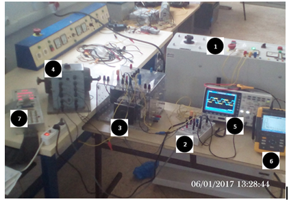 The validation of the results obtained previously requires the experimental realization of the simulated assembly, by using a three-phase voltage source, a rectifier and a DC motor. Regarding the THD measurements, the instrument (Fluke 435II) and an oscilloscope have been used to visualize the different waveforms. The filtering process is performed through the Simulink/Matlab environment. Figure 10 shows the experimental setup realized for this study.