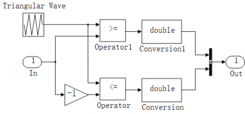 The push-pull type pulse width modulator realizes the 180˚ phase differential modulation of two channel output of identical frequency pulse signals to prevent two switch tube turn on at the same time. Figure 6 shows the principle of pulse width modulation basis on MATLAB/simulink, Comparing the modulation signals of opposite polarity with the carrier signal of isosceles triangle wave. When the carrier signal is greater than the positive modulation signal is obtained when the output is high level, the output of a road wave, the opposite when the carrier signal is greater than the negative modulation signal is obtained when the low level output, another wave, both the phase difference of 180˚. Figure 7 shows the model of pulse-width modulator. Figure 8 shows the output waveform of the PWM module.