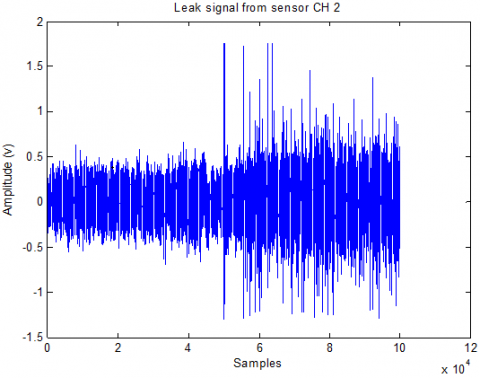In this test, we placed the first sensor at a distance of $20 \mathrm{cm}$ and the second at a distance of $30 \mathrm{cm}$ from the leak. The sensors are oriented towards the leak. The signal of the channel one: as shown in Figure $10,$ a two-part signal is seen in the time window. The first without leakage and the other leaked. It is obvious that the leak is triggered in the middle of the time of acquisition of channel $(\mathrm{CH} 1)$