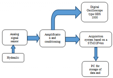 Our leak detection system is based mainly on the acoustic kit (measuring microphone and amplifier) for the capture and conditioning of analog audio signals, and on the STM32F4xx board for the acquisition and digitization of data before the treatment phase in a PC using numerical techniques. In this diagram, we present the different operating blocs used for the acquisition of sound Leakage signals (Figure 2).