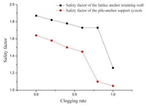 (1) Whichever the clogging rate, the pile-anchor support system achieved a higher safety factor than the lattice anchor retaining wall; with the growth in the clogging rate, the safety factors under two supporting structures both decreased gradually; the decrement was relatively small, when the clogging rate was below 60%.