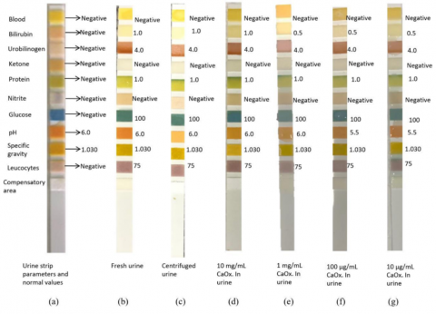 Urinalysis has been done using the urine strips with the urine samples containing different concentrations of CaC2O4.H2O. Calcium oxalate-hydrate was artificially introduced into centrifuged urine to compose the following range of concentrations i.e. 10 mg/ mL, 1 mg/ mL, 100 μg/mL and 10 μg/mL of urine, while centrifuged urine was used as a reference.
