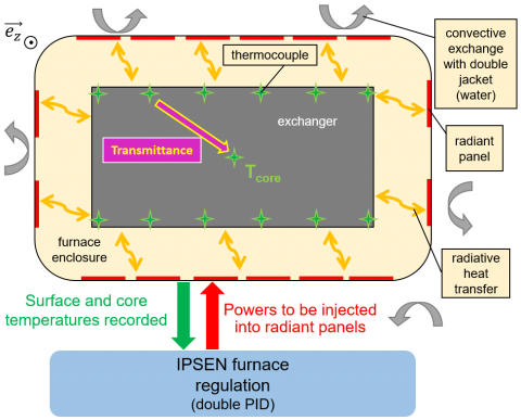 The heat transfer modes involved are radiative (heat transfer between the radiant panels of the furnace and the aluminium exchanger and other additional elements included in the enclosure), conductive (within the load itself), and convective if we consider the furnace enclosure which is a double jacket where water circulates (cold source for regulation). In the enclosure, 88 panels exchange heat by radiation with the load, which is equipped according to its geometry with a few dozen surface thermocouples (exchanger skin) and at least two core thermocouples in the event of a malfunction of one of them. By strategically combining the skin sensors with the panels, i. e. by placing them so that they face each other, the temperature gradient in the load is monitored and controlled during the cycle so that the heating is as homogeneous as possible. With respect to the 6 exchangers studied here, 36 surface sensors were used for each. In the diagram in Figure 2, a heat exchanger in the furnace enclosure, its instrumentation and the associated control strategy are represented in the (x,y) plan. The radiant panels are schematized in red and the temperature sensors in green. An example of transfer function is the transmittance between two points inside the exchanger. As this is a horizontal cross-sectional view, only 16 of the 88 panels have been represented, and the same applies to the 12 of the 36 skin thermocouples.