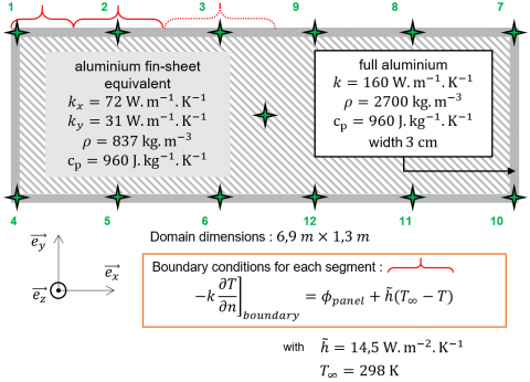 Thanks to a direct resolution of the 2D model produced with FlexPDE®, temperature profiles can be obtained as a function of time for Tskin (at several locations) and Tcore. The different data sets should then be used to test the sensitivity of the “ideal case” transfer functions to a list of defects and anomalies that may be encountered in reality. This model, whose geometry and different properties are shown in Figure 3, represents a horizontal section of an aluminium exchanger. Boundary conditions include a term simulating the heat flux input of the radiant panels as well as a loss term corresponding to the cooling of the furnace enclosure.
