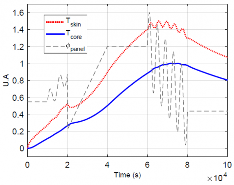 The first issue of this modeling is to verify that the ARX parametric models are adapted to the transfer functions studied. For example, for thermocouple No.2: the calibration and validation signals from the FlexPDE direct reference simulation are those of Figure 4: ϕpanelrepresents the input flux used to obtain Tskin et Tcore for the model calibration (rectangular excitation in Figure 4.a) and its validation (Figure 4.b in which the input flux has a more complex shape).