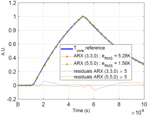First, we verify whether ARX models can be properly estimated (Figure 5.a), i.e. whether they can correctly reconstruct the reference core response of the direct numerical model. The optimal model is the one that minimizes the RMS criterion on residuals: here the (5,5,0) one.