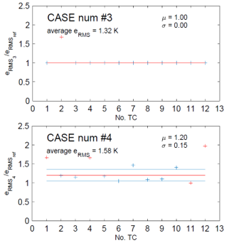 2: a slight modification of the conductivity in the entire domain clearly amplifies the eRMS error to such an extent that the models cannot be considered validated in this case (eRMS 2 = 4.8 K on average.) The severe amplification of the mean square error is therefore global, as might be expected by simulating a default in the whole domain;