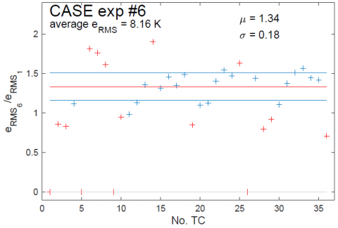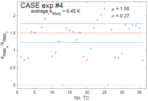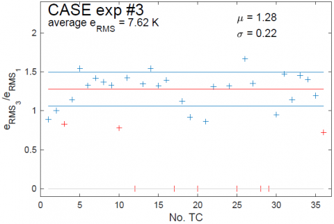 In the graphs in Figure 8, two filters have been applied, the first consisting of excluding malfunctioning thermocouples (the ordinate of the corresponding red "+" being set to zero), the second being the same as in section 3.