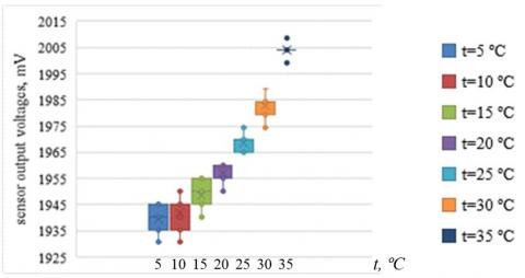 where, $S_{t}^{U}$ is the sensitivity of the sensor to temperature changes, mV/℃; Umax, Umin are the maximum and minimum output voltage values of the sensor in the operating temperature range, mV; tmax, tmin are the maximum and minimum temperature values in the operating range, ℃.