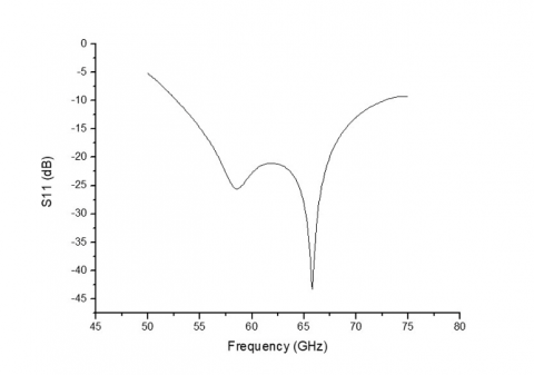 Figure 3 shows the plot of return loss as a function of frequency. The related bandwidth is defined as the frequency range where the return loss is less than 10 dB. The solver shows an impedance bandwidth of 33% that covers the unlicensed frequency spectrum around 60 GHz. Two resonance frequencies are observed according to the return loss graph. A good impedance matching is obtained because of the good choice of probe position to connect the strip line to the radiating element. The same probe allows the use of a thicker substrate for getting larger bandwidth. However, the substrate thickness should be chosen carefully to not allow surface wave propagation.