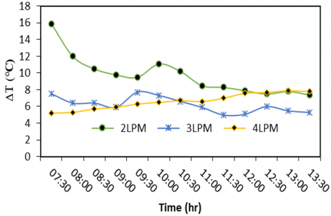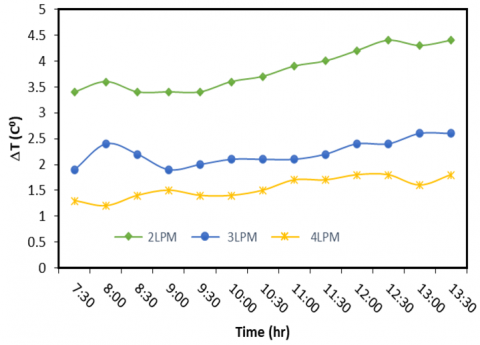 When the water entry temperature increases to 40℃, the temperature change continues to decrease with time, as shown in Figure 6. As for the effect of the rate of water flow on the change in the temperature of the outgoing water, when increasing the flow rate from 2 LPM to 3 LPM, the rate of change begins to decrease, and this is the same explanation in Figure 7. While at 4 LPM, the changing temperature of outlet water increases with time. This is because the outlet water temperature fluctuates. By increasing the inlet temperature of water to 50℃, the change of temperature of outlet water with time becomes unstable for all flow rates at a range of time (7.30 am-11.30 pm). After this period of time, the change in temperature becomes stable where it is close to (26.4℃, 22.4℃, 5.5℃) for (2, 3, 4 LPM) respectively.