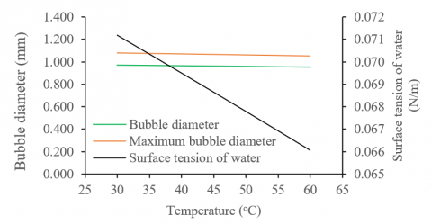 Figure 4. The effect of temperature on the surface tension of water and bubble diameter