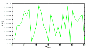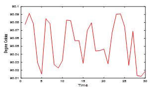 To observe the accuracy of vital parameter exchange over the simulated network, five vital parameters, namely temperature, diastolic, systolic, pulse rate, and SpO2, are observed. Vital parameters are generated using the Matlab interface, where a random, varying signal is generated with a range of vital limits. Observations for the vital signals are shown in Figures 10-14. The network is interfaced with vital parameters using external text files. Variations in patient vitals are observed for a period of 30 seconds, as illustrated in the below figures.