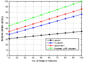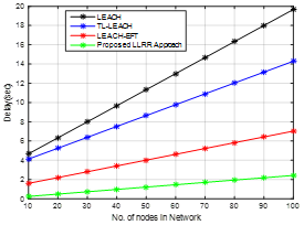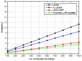 Observation of simulated networks for varying packet exchanging counts with LRRR, illustrates an increase in alive node count by 34, an increase in network lifetime by 71.3 msec, and the delay is observed to be minimized by 8 sec, as compared to LEACH, at 1000th packet exchange. Also, there is an increase in alive node count by 24, increase in network lifetime by 33.2 msec, and the delay is observed to be minimized by 4.6 sec, as compared to TL-LEACH. The simulated results also show an increase in alive node count by 11, an increase in network lifetime by 21.1 msec, and the delay is observed to be minimized by 0.4 sec, as compared to LEACH-EFT. The performance metrics are tabled in Table 3 below: