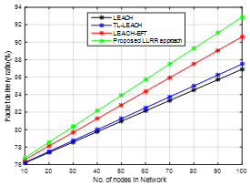 The packet delivery ratio (PDR), defined as a ratio of the volume of data received at destination over the volume of data being transmitted from the source, is presented in Figure 19. The observation of packet delivery ratio for varying node counts in the network is illustrated. With the rise in the number of nodes in the network, PDR for the network is observed to increase. The availability of additional nodes increases the routing probability and node availability, which results in an increase in higher data exchange rates. However, conventional LEACH, TL- LEACH, and LEACH-EFT methods perform data exchange over a less reliable path, as no measure is taken measures the reliability of the path before selection. The proposed method selects the path with the highest reliability factor using data exchange characteristics in the network. This minimizes the blockage factor in the network generated due to retransmission of packets. The proposed method selects the routing of data packets having a higher forwarding probability, hence improving the packet delivery ratio in the network. The simulated graph (Figure 19) shows that, at 100th node, the PDR values for LEACH, TL-LEACH, and LEACH-EFT are observed to be 87, 87.8, and 90.5 respectively. The proposed method is observed to increase PDR by 5.4%, 4.6%, and 1.9% as compared to the existing LEACH, TL-LEACH, and LEACH-EFT approach respectively.