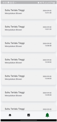 Figure 10 shows a graph of changes in temperature, humidity and ammonia sensor values. Based on the graph, it shows that the sensor can measure data continuously and in real time. Figure 11 shows the notification display in the smart cage application when the cage temperature exceeds the temperature set by the user.