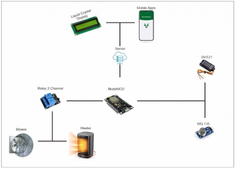 Figure 2 shows the block diagram of the smart cage. This system uses a DHT 21 sensor to detect humidity and an MQ 135 sensor that functions to measure ammonia levels to detect the smell of the cow cage. The temperature and humidity values read by the DHT 21 sensor and the ammonia level read by the MQ 135 sensor will be input for the nodeMCU (esp8266). NodeMCU functions as a microcontroller that can process data and provide output that will activate the relay to activate the blower and heater automatically. In addition to being a microcontroller, the nodeMCU also functions as a communication medium for sending sensor data to the server using wireless waves. The frequency used by the nodeMCU in this system is 80 MHz which is used for data processing and running programs and 2.4 GHz which is used for sending data to the server so that the results of data processing can be displayed via the Android application. This entire system uses electrical energy from the state power plant (PLN), so the power required is stable.