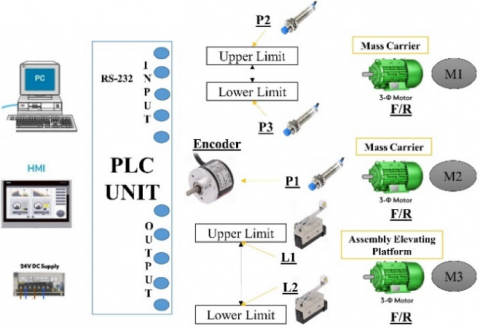 Three proximity switches are added. The first one is used for home position detection. This signal will allow the encoder to operate motor 2 (M2) according to motion control angle-step. The used encoder has one step, so each step equals 1o. The first motor (M1) must operate forward and reverse according to constant stroke. Therefore, two proximity switches are added. The first (P2) is used for the upper limit, while the other (P3) is used for a lower limit. An assembly elevating platform changes the medium of weighing from air to liquid and vice versa. Motor 3 (M3) is used for this operation. Therefore, two limit switches are added. The first is used for the upper limit (L1), while the second is for the lower limit (L2).
