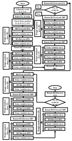For automatic calibration, the sequence of the calibration process is shown on Figure 8. All sensors are normally open. Firstly, HWA-NIS checks that the home positions P1, P2, and L2 are ON. Then, the weighing process is ready to start. M1 operates in a forward direction till it reaches (P3). After that, stability time to let the balance be stable. Then, M2 rotates 180o in the forward direction. Now, the test mass is ready to weigh. M1 operates in a Reverse direction till it reaches (P2). After that, stability time to let the balance be stable. They are weighing reference mass (R). Then, the (T) mass is weighed again using (P3) and (P2) in forward and reverse directions. Then, M2 rotates 180o in reverse direction. Now, the reference mass is ready to weigh. Then, the (R) mass is weighed again using (P3) and (P2) in forward and reverse directions. Then, the number of cycles will be checked. If No. of cycles is not equal to the set value, the weighing process will be repeated. Else, M3 will be actuated till reaching (L1). Then, the weighing process will be repeated according to the number of cycles after the masses are immersed in the distilled water. Finally, M3 will be actuated till reaching (L1).