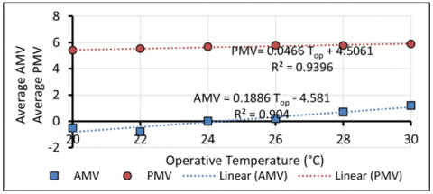 The slope of the line represents the thermal sensation vote for the optimum temperature. It is observed that the AMV is more sensitive than the calculated PMV index. The trend of the AMV and PMV results in the current case study matches many previously reported investigations, like the works of Cheung et al. [15], Lin and Deng [47], Yao et al. [38], Kim et al. [41], and Fanger [42].