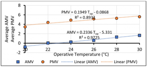 Figures 5 and 6 represent the trends of AMV and PMV against the operative temperature, Top, respectively. The AMV values were obtained through a questionnaire survey during the subjective study using the seven-point comfort scale to record the ‘comfort vote’ at different operating temperatures. The participants also recorded their metabolic rate and clothing insulation level in the subjective study. The PMV values were calculated using the existing heat balance theory, expressed in Eq. 11.