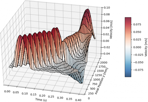 The effect of the amplitude of the half-sine wave on the results was examined in the three-dimensional straight cylindrical model employed in this study. For this verification, a homogeneous straight cylindrical model with a length of 1000 mm and a wall thickness of h=2 mm was adopted, as in Section 3.1. The analysis focused on the propagation of a single pulse wave and the amplitude of the reflected wave generated at the outlet boundary. The amplitude of the half-sine wave was varied in four conditions, including those used in the main text (0.10 m/s), with values of 0.05, 0.15, and 0.20 m/s. Figure A1 illustrates the amplitude of the reflected wave in the region 800 mm ≤ y ≤ 1,000 mm near the outlet for each inlet velocity condition. As shown in Figure A1, the amplitude ratio increased with increasing inlet velocity. However, no significant difference was observed for amplitudes of 0.10 m/s or higher. Given that the maximum blood flow velocity in the human aorta generally exceeds 0.10 m/s and is unlikely to be as low as 0.05 m/s, the variation in amplitude is considered to have minimal influence on the results presented in Section 3.2.