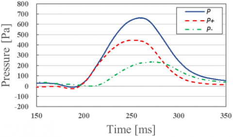 Based on the characteristic equations of one-dimensional analysis assuming a homogeneous, inviscid, and incompressible fluid flow in an elastic tube, Parker and Jones [8] proposed a method to separate pulse waves into forward and backward components, this separation method was employed in this study. Four patterns exist for the relationship between pressure and velocity (Table 1). The velocity is determined by whether the pressure is higher or lower than the reference pressure (compression or expansion) and whether the pressure wave is forward or backward. For example, a forward compression wave increases the velocity. The phase of the pressure wave is determined by the acoustic impedance changes at discontinuities [13]. Pressure waves exhibit phase inversion in aneurysms, whereas their phase remains unchanged in stenotic regions [7, 14]. In these cases, the pressure and velocity waves become antiphase. Assuming a one-dimensional analysis, the pressure and velocity waveforms can be expressed as the sum and difference of the forward and backward components. This makes it possible to separate the waves into their forward and backward components. In this study, the characteristic impedance $Z=\rho c$ was employed, and the pressure and velocity were separated into forward and backward components using Eqs. (8)-(11):