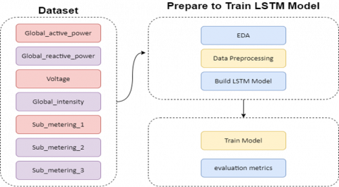 The research framework developed for this study is presented in this section; The method begins with a literature review and concludes with an assessment of the research's results. The literature review was aimed at looking for methods already in use for the prediction of household electric power usage. In the suggested methodology, there are 3 stages, and the output of each stage is used as the input for the next. Phase 1 is about the dataset reading while phase two is about pre-processing phase for preparing to train the LSTM- FDLE model. Finally, phase three is about model training and evaluation of the research achievements. Figure 1 depicts in detail the general methodology of the proposed LSTM- FDLE model.
