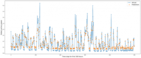 Figure 8. Actual vs predicted power consumption values for the first 500 h